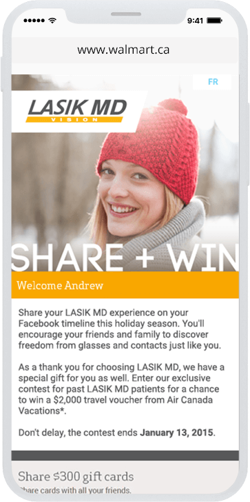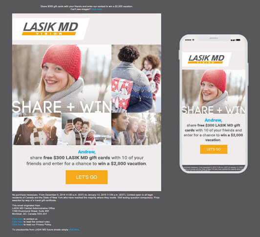 Before referral programs were a standard feature of every marketing platform, LASIK MD was running one with social sharing, digital gift cards, and fully responsive email — built from scratch in an era when most email was still designed for desktop only. I designed and built this multi-channel referral campaign at a time when the tools and conventions we now take for granted were still being invented.