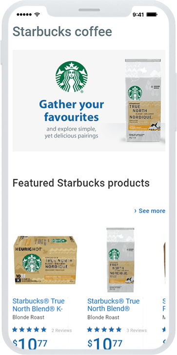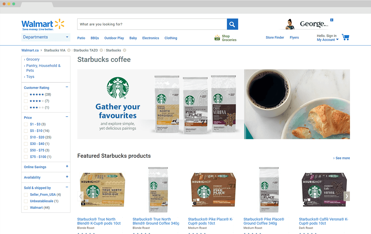 Starbucks' lineup of roast blends can be overwhelming for a casual coffee shopper. The brief called for a brand store that felt like a Starbucks experience — warm, knowledgeable, and guided — while still functioning as a high-conversion retail page within walmart.ca's platform.