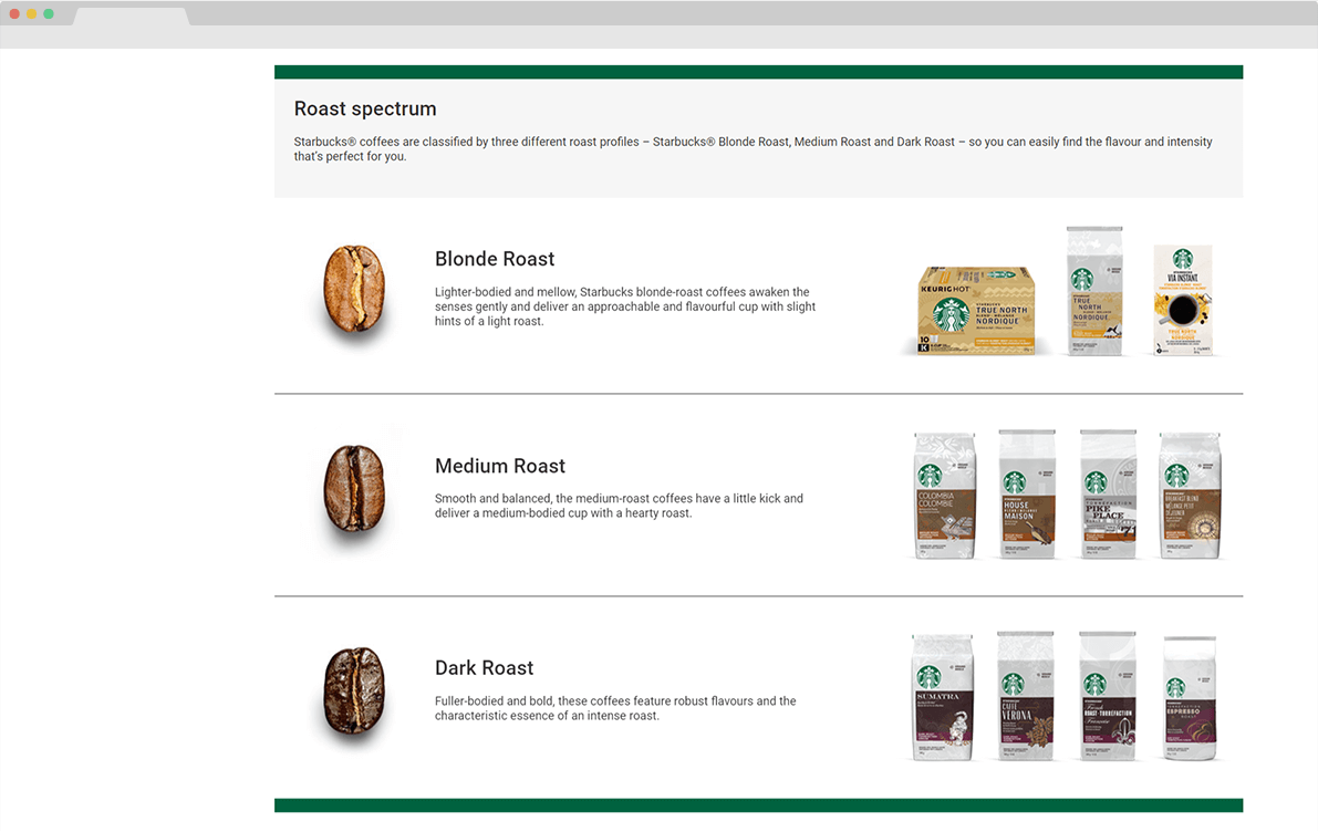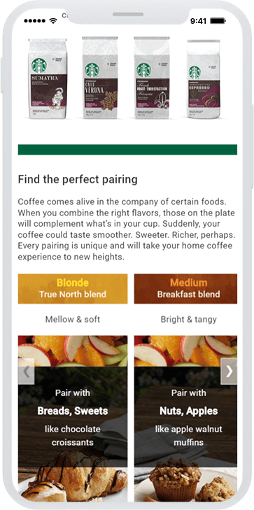 Most retail pages tell shoppers what to buy. This Starbucks brand store on walmart.ca taught them how to choose. I designed, built, and wrote the content strategy for a shopping experience centered on Starbucks' roast blends — using educational pairing content to guide purchase decisions and reduce the choice paralysis that comes with a broad coffee catalog.